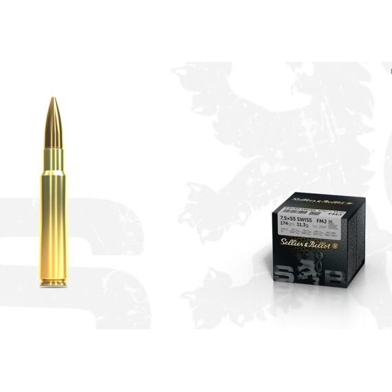 Kvalitní a výkonné náboje ráže 7,5 x 55 SWISS od společnosti Sellier & Bellot. Toto balení obsahuje 50 ks těchto nábojů. Samotná střela je celoplášťová neboli v provedení FMJ (Full Metal Jacket). Olověné jádro je pak překryto kovovým pláštěm (CuZn 10). Gramáž střely je 174 grs.
