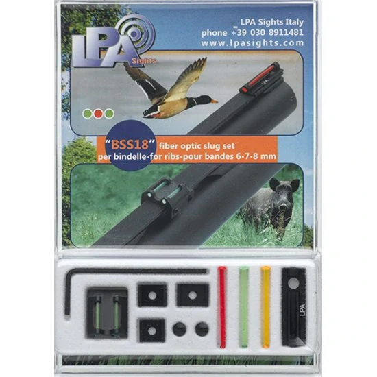 Univerzální světlovodná mířidla výrobce LPA jsou určená pro brokovnice s šířkou lišty 6, 7 a 8mm. Sada obsahuje zadní mířidla se dvěma zelenými světlovodnými vlákny, přední mušku se závitem 2,6 mm a závitem 3 mm, 3ks náhradních světlovodných mušek ( červená, žlutá a zelená)a klíč pro utažení miřidel.